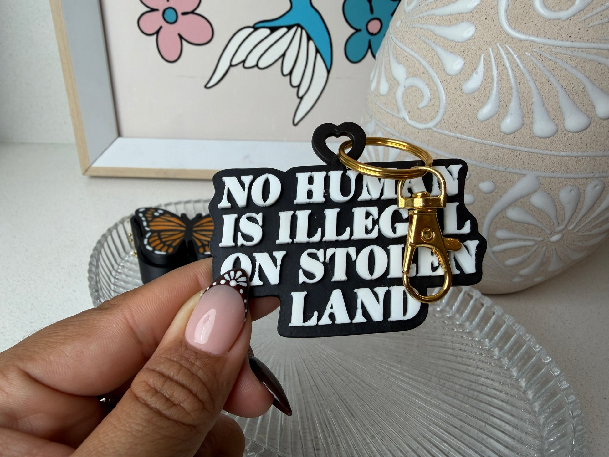 Make a statement that matters. This gold-finished keychain boldly features the powerful message “No Human Is Illegal on Stolen Land,” reminding us that compassion, justice, and truth never go out of style. Both elegant and unapologetic, it’s a daily reminder to carry your values wherever you go.